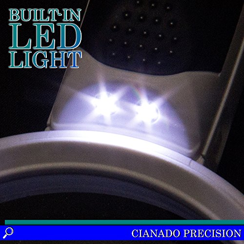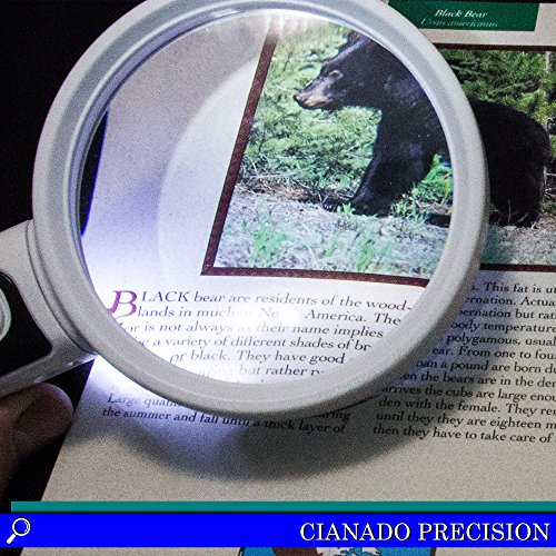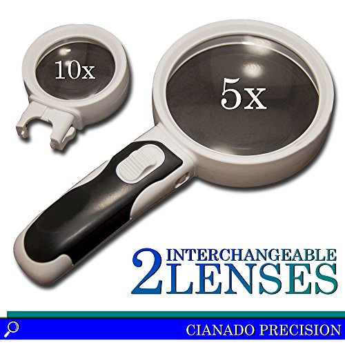 -. Feature : PERFECT FOR HOBBIES: The Cianado Handheld LED magnifier with light is the perfect solution to your vision needs. It will help to magnify the smallest pieces of any of your arts & crafts or work projects. Invest in this convenient magnifier so that you can enjoy your hobbies and work without straining your eyes to see. / GREAT FOR READING: The Cianado Magnifying glass enlarges words on labels and pages so that you can read even the tiniest print. It will make your life easier when trying to read prescription labels, nutrition labels, books, magazines, newspapers and computer screens. Invest in this magnifier so that the stress on your eyes is reduced and you can enjoy reading without stress. / HELPFUL FOR SENIORS: This magnifying glass with a light is perfect for any senior who is suffering from macular degeneration or other hindrances to their eye sight. This will magnify all of their favorite hobbies and will help them to read books, view stamp and coin collections, and view computer screens. Get this helpful magnifier so that your beloved senior can continue the activities he or she loves! / LARGE LENSE WITH ERGONOMIC HANDLE: Our magnifying glasses are 2 inches and 3.5 inches across so that they cover a large amount of space and you can see a good amount of any picture. This set comes with two lenses of 5x and 10x magnification so that you can adjust to your needs and see with ease. The ergonomic handle is 4 inches long and comfortable enough to hold for long periods of time without hurting your hand. / LOVE IT OR YOUR MONEY BACK: We believe that our LED Magnifier is the best and highest quality illuminated magnifying glass on the market, and we know that you will love yours. However, if for any reason you are not 100% satisfied, please contact us for a full hassle-free refund or replacement! Factory warranty is only available from authorized sellers. Cianado Precision is the only authorized seller of this product.