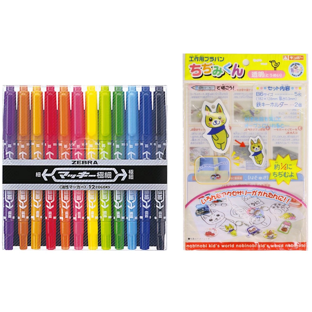 【セット内容】マッキー極細 12色セット+工作用プラバン ちぢみくん 【12色】黒・赤・青・ライトブルー・緑・ライトグリーン・黄・ピンク・紫・オレンジ・ライトブラウン・茶 【ペン先】細字・極細両用【線幅】細字:1.0~1.3mm/極細:0.5mm 【インク】油性染料インク/速乾性・耐水性 【プラバン】B6サイズ(182×128×厚さ0.3mm)×5枚入り/鉄ホルダー×2個入り