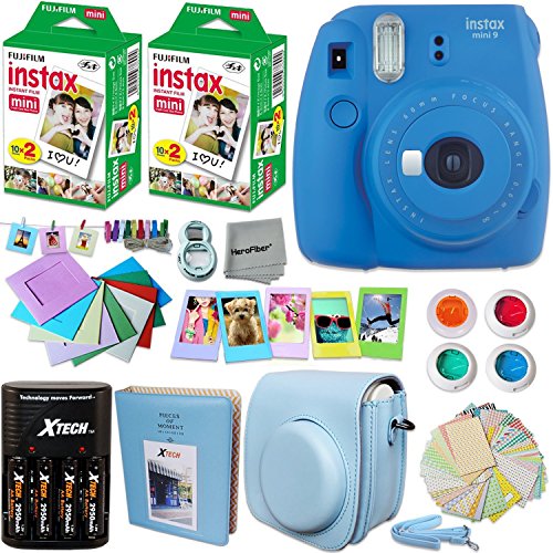 Fujifilm Instax Mini 9 Instant Camera COBALT BLUE + INSTAX Film (40 Sheets) + Accessories Kit / Bundle + Custom Fitted Case + Photo Album + 4 AA Rechargeable Batteries & Charger +Assorted Frames +MORE