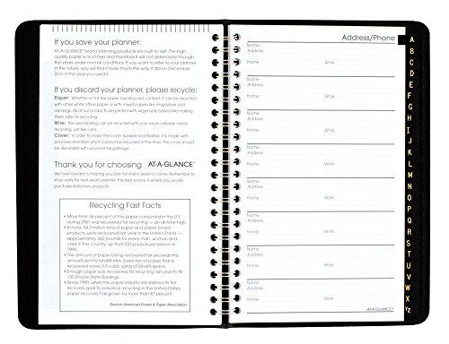 - Feature : Keep track of your weekly appointments and contacts in classic style; improved paper resists bleed through*; Made in the U.S.A. / 12 months of planning power, January-December; Julian dates; 4.88 x 8 inch page size; 5.31 x 8.37 x .50 inches overall / Hourly appointments, 8 a.m.-5 p.m.; one week per two-page spread / Includes a tabbed telephone and address section / Printed on quality paper containing 30% post-consumer waste; black simulated leather
