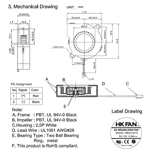 2pack 50mm x 15mm 5015 12V Dual Ball Bearing DC Brushless Cooling Blower Fan BB5015H12 with 2 Pin Terminal UL TUV