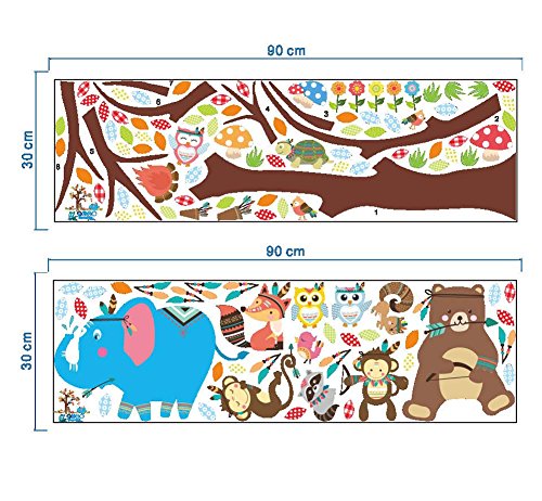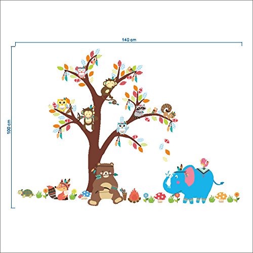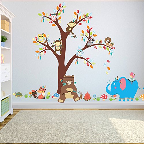 BIBITIME Indian Forest Animal Tree Branch Squirrel Owls Monkeys Wall Decal Turtle Fox Arrow Bear Birds Elephant Vinyl Sticker for Nursery Classroom Bedroom Kids Room Decor