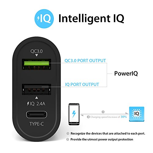 -. Feature : ★Time Saving★: The latest, fastest and most efficient USB charging technology in the world. Up to 4X faster than standard chargers, able to charge compatible devices to 80% in just 35 minutes. Less time charge, more time play. / ★Compatible More★: Backwards compatible with all versions of Qualcomm Quick Charge technology (1.0, 2.0 & 3.0). Also compatible with USB-C and provides standard charging for non-Quick Charge devices. / ★Convenient Type C★: Reversible-plug connector allows more convenient plug in. Both positive and negative sides can charge your devices. / ★Intelligent IQ★: IQ technology enables it to recognize the devices that are attached to each port and provide the utmost power output that the specific device can accommodate. / ★Dual Charging Ports★: Dual AiPower Charging Ports dedicated 2.4A and 3.0A each. Charge 3 devices simultaneously.