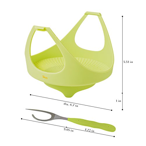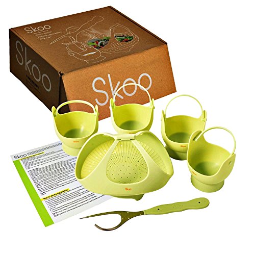 •The SKOO steamer basket will fit in a 3 quart pan, has high walls on each side to keep the content inside and flexible handles. •The SKOO egg poaching cups have stable base,rotatable handles and thick,sturdy silicone material.
