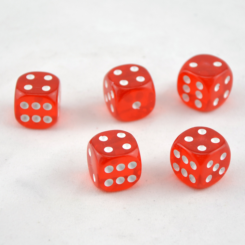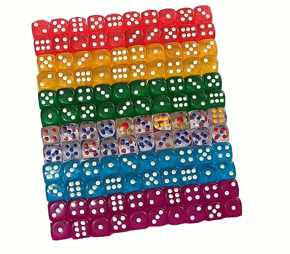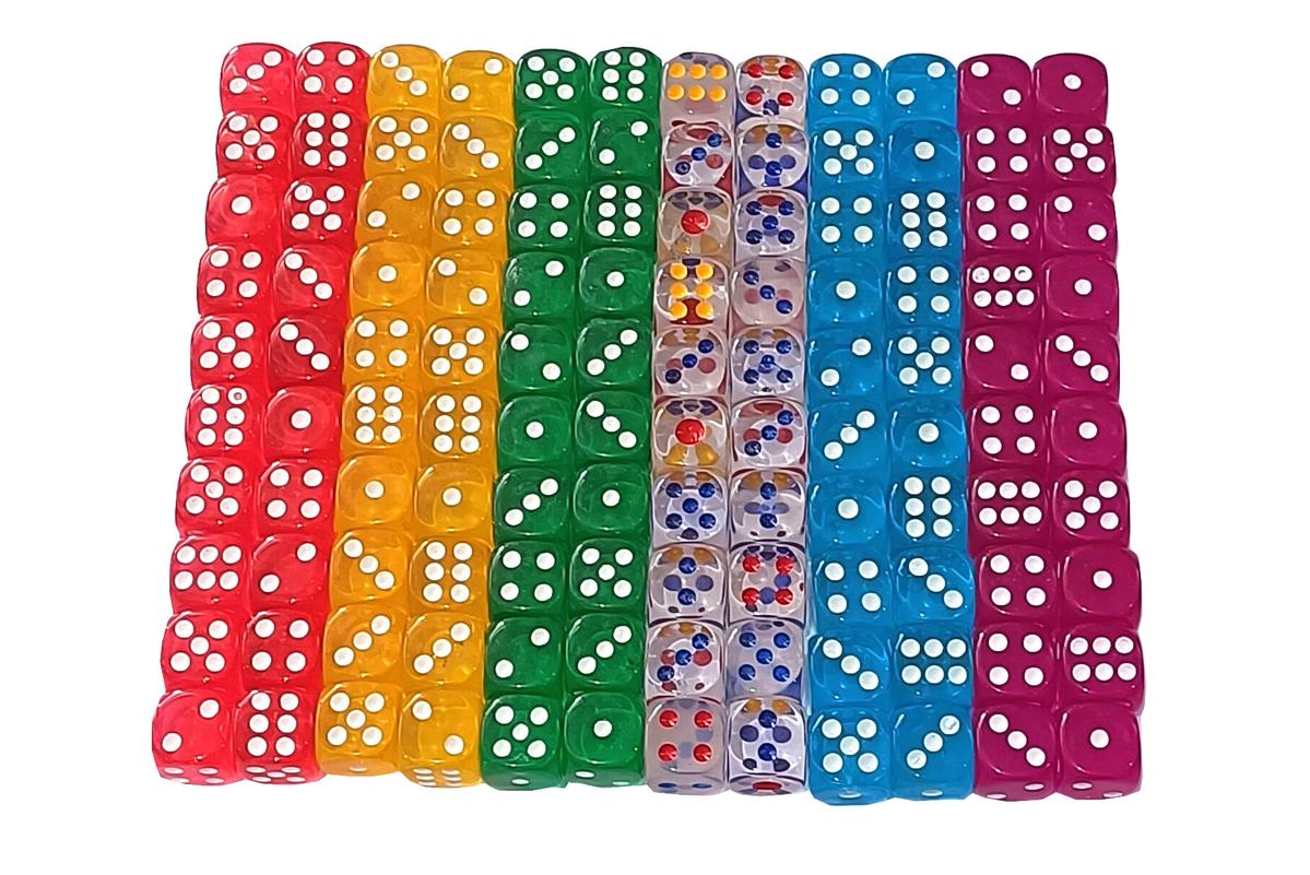 ・セット内容:サイコロ×100個(赤、黄、青、紫、透明×各20個)