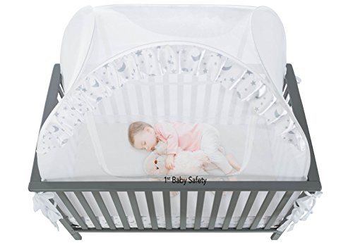 POP-UP CRIB TENT THE ONLY SAFE SOLUTION! - Made using strong soft to touch BPA Free mesh netting, the self-supporting safety frame is flexible spun wire it will hold to its original shape even after movement. The crib tent installs in seconds with no assembly required. The crib net sits snugly inside the crib for safety. No lose netting so your baby can\'t get tangled. The bottom of the net sits well under the mattress. The net closes securely with an auto locking zip.