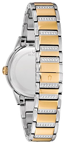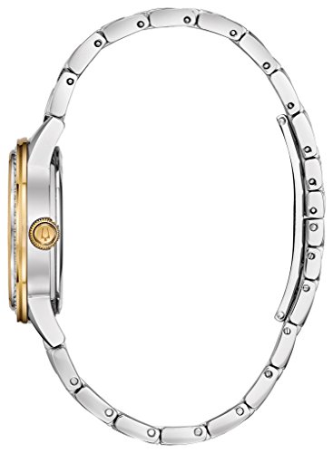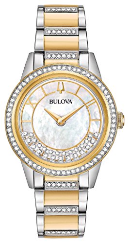 Embellished Mother of Pearl dial features gold-tone hands and hour markers, minute track, and Bulova detailing.