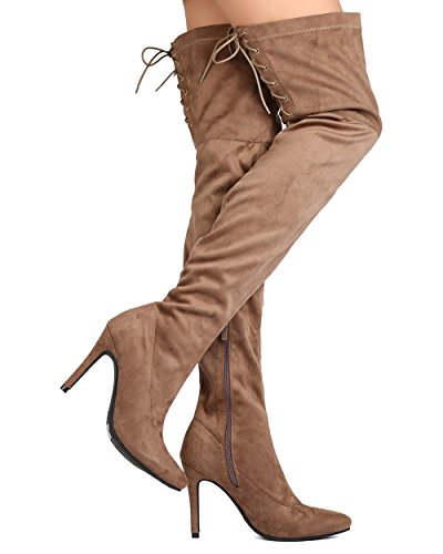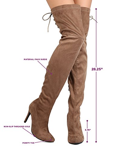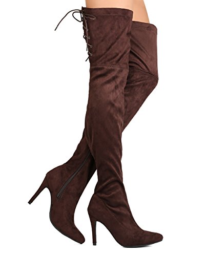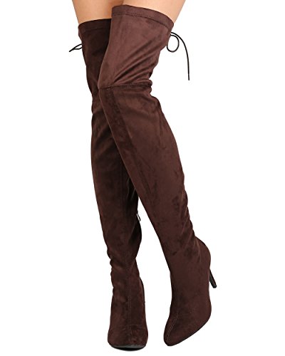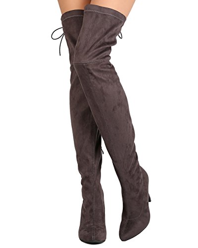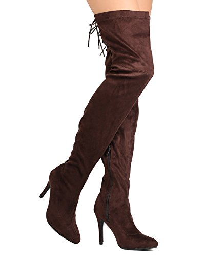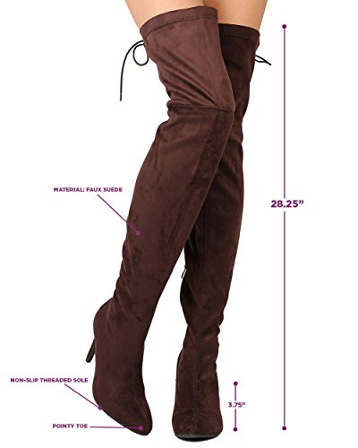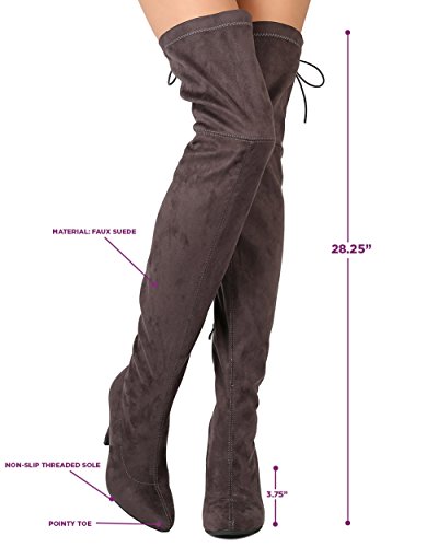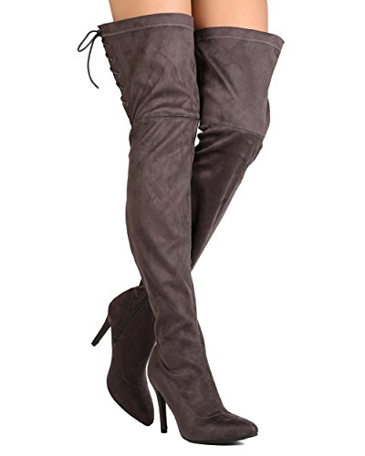 Studio : Indulge Publisher : Indulge Binding : Apparel Product Description These super sexy thigh high boots are made with a faux suede upper, pointy toe, and stitch accents. Also made with a single sole, covered stiletto heel, and side zip for easy slip on and off. Hind lace up feature gives room for adjustment on the opening and adds a sexy detail from behind. 0