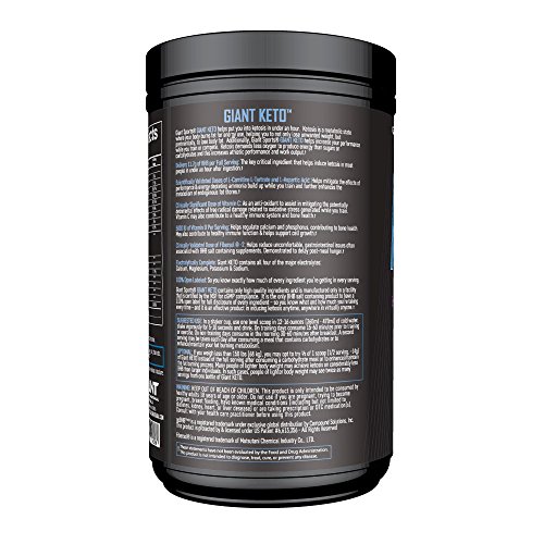 -. Binding : Health and Beauty -. Brand : Giant Sports -. Feature : 14.6g OF BHB SALTS PER SERVING: Giant KETO contains more of this critical ingredient than any other exogenous ketones supplement on the market. The patented beta-hydroxybutyrate blend was created to help you reach ketosis in under an hour and keep you in that desired, fat-burning state. / SETS THE STANDARD FOR TASTE: It's no secret; BHB supplements have a strong, tart taste. The flavor experts at Giant Sports made it a P.R.Iority to create the best-tasting BHB product on the market. And we didn't just do it with one flavor-we have 3! Keto mixes easily without leaving any residue, giving you a great-tasting drink you will actually enjoy! / UNIQUE INGREDIENT PROFILE: Keto contains ingredients not currently found in any other ketone powder. Our formulators took your goals and well-being into account when creating Giant Keto. Keto helps increase physical performance, mental focus and energy while aiding with the fat-burning benefits of a ketogenic diet and exercise. / 100% OPEN LABEL: Keto is the FIRST, fully open-label keto powder available. We think you should know exactly what you are getting in each and every serving. No blends or complexes. No misleading labels. Just quality exogenous ketones with no artificial flavors, sweeteners or colors. Keto is also Gluten Free, Dairy Free, Sugar Free, and Vegan Friendly / THE FORGIVENESS FACTOR: Nothing is worse than slipping up, or accidentally eating hidden carbs while following a ketogenic diet. Giant Keto can help erase that worry, and keep you on track and in ketosis. You can easily check your levels using a urine test strip or through a blood ketone meter to ensure you are still in ketosis -. IsAdultProduct : 0 -. LegalDisclaimer : These statements have not been evaluated by the Food and Drug Administration. This product is not intended to diagnose, treat, cure, or prevent any disease. Other Ingredients: -. PackageQuantity : 1 -. ProductGroup : Health and Beauty -. ProductTypeName : HEALTH_PERSONAL_CARE -. Title : Giant Keto Exogenous Ketones Beta-Hydroxybutyrate BHB Salts Supplement Designed for Ketosis to Burn Fat, Energy and Support For Ketogenic Diet-Raspberry Lemonade 20 Servings