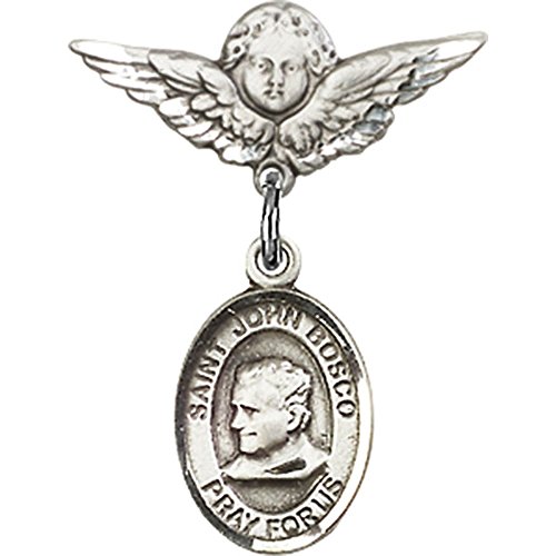 -. Title : Sterling Silver Baby Badge with St. John Bosco Charm and Angel w/Wings Badge Pin 7/8 X 3/4 inches