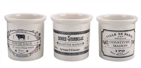 - Set of 3 French stoneware style crocks, each one is different. The labels are vintage reproduction. You could buy the antique version, but why would you when these reproductions are a fraction of the cost, 4-3/4"H
