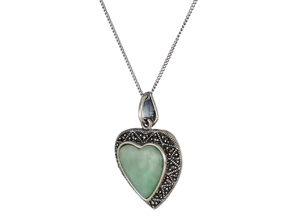 Sterling silver necklace featuring heart shaped Jade and Marcasite.