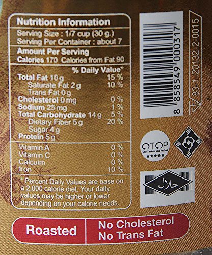 -. Feature : Unfried. Roasted in small batches with no added oil! Free of chemical preservatives and flavor enhancers. / Vegan. Zero % cholesterol, full of healthy unrefined mono-unsaturated fats good for your health. No trans fat, all natural. / Helps absorb fat soluble vitamins and nutrients. Rich in B vitamins, K, folate, copper, magnesium and iron / GMP certified. Quality guaranteed. Halal / Conveniently packed in canisters of 7 ounces. Easy to carry around.