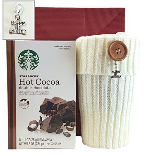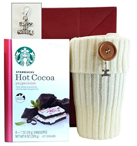 Graduation Gift Bundle (4 Piece Set - Starbucks Cocoa, Travel Coffee Mug, White Knit Sweater Sleeve, 2016 Charm)