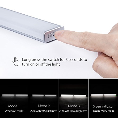 4 SETTING SWITCH: This Light Strip has Always On / Sensing (40% Brightness) / Sensing (100% Brightness) / Off, multi working modes meet your different occasions and needs. It's a perfect choice to be used in closet, kitchen cabinets, bathroom, stair, over-sink lighting, front porch, front door, garage, laundry room, bedroom, hallway, workshop, office, etc.