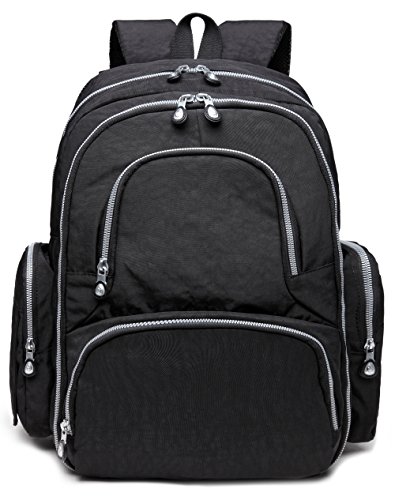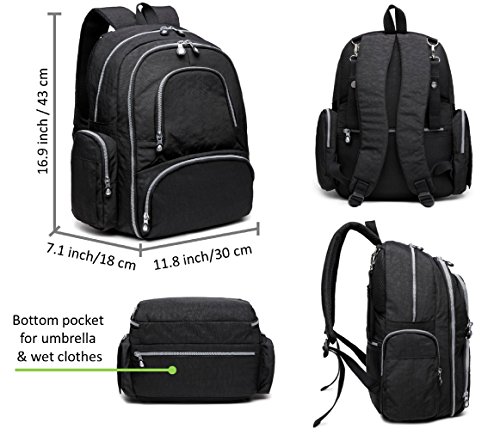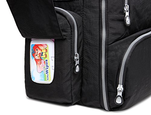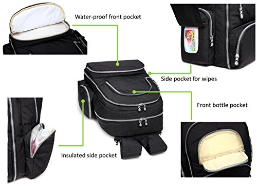 Raising a baby is hard, but carrying all their gear doesn't have to be! Crest Design's Diaper Backpack is designed for maximum parental comfort, whether you wear it like a backpack or strap it to your baby's stroller (straps included!). Easy-to-clean, waterproof nylon material keeps messes at bay and is durable enough to withstand daily use. Multiple compartments for organizing baby's diapers, wipes, bottles, and toys, including a large main compartment, front bottle and diaper pocket, and various side pockets, including an easy-access wipe-dispensing side pocket. A secret bottom pocket is great for putting wet clothes and other wet items. Crest Design's Diaper Backpack is manufactured using safe materials free of lead and other harmful chemicals. *Bonus Changing Pad and Insulated Bottle Holder Included*