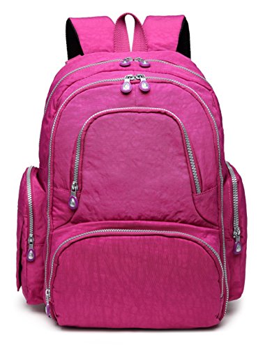 Functionality of a diaper bag, comfort of a backpack, in stylishly bold colors. Made of durable waterproof nylon fabric, with padded, adjustable shoulder straps, and padded back for extra comfort. Can be strapped to a stroller (straps included).