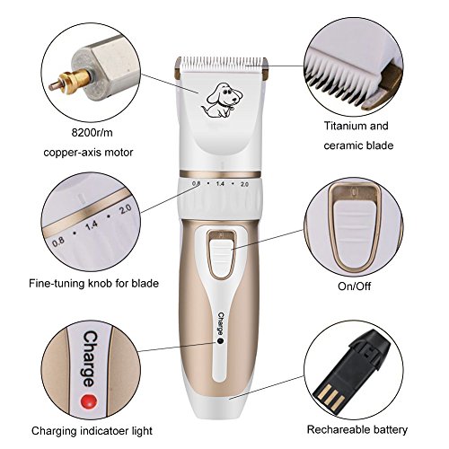 New User Friendly: Our pet clippers contains 4 attachment guide combs(3/6/9/12mm) for trimming length,and the fine-tuning knob offers five level of length (0.9-2mm)for precise adjustment on hair length. You can safely trim your pet even if you've never done it before and make your pet look more beautiful.