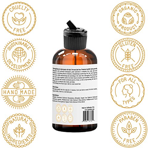 -. Feature : FIGHTS HAIR LOSS. TREATS VARIOUS SCALP CONDITIONS. PROMOTES NEW HEALTHY HAIR GROWTH. Rejuvenates hair follicles. Strengthens & protects the hair. / MADE WITH 100% PURE, HIGHEST QUALITY, CERTIFIED ORGANIC INGREDIENTS. Our ingredients are sourced from devoted artisan distillers who steam-distill small batches of fresh floral and plant material strictly to produce hydrosols. / EARTH FRIENDLY, SAFE AND NON-TOXIC. NO HARMFUL CHEMICALS USED - Contains NO sulfates, alcohol, parabens, gluten, phthalates. GMO-free. Vegan. Not tested on animals. Packaged in recyclable BPA-free bottles. / EXTRA KIND & GENTLE to your scalp and hair. Nourishing for all hair types. Safe for color-treated hair. 100% preservative free. / HAND POURED WITH LOVE AND EXTRA CARE. Proudly made in California, USA.