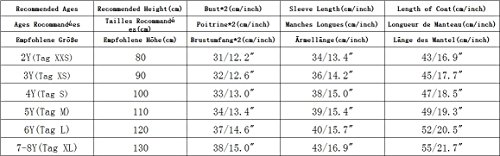 -. Binding : Textilien -. Brand : Tangda -. Department : Mädchen -. Feature : Dies ist eine der beliebtesten Wintermantel, schön und warm / Sehr geeignet für Kinder 3-8 Jahren / Es kann als Schneeanzug sein / Bitte beachten Sie die Informationen der asiatische Größe -. IsAdultProduct : 0 -. ProductGroup : Apparel -. ProductTypeName : OUTERWEAR -. Title : Tangda Kinderjacken Mädchen Mantel Kunstpelz Winterjacke mit Rosa Blumen Mädchenmantel Spitze Unifarben Innen Baumwolle Mädchen Jacke für 2-8 Jahren (Größe/Farbe Wählbar)