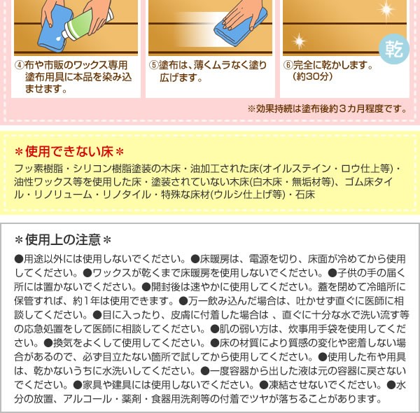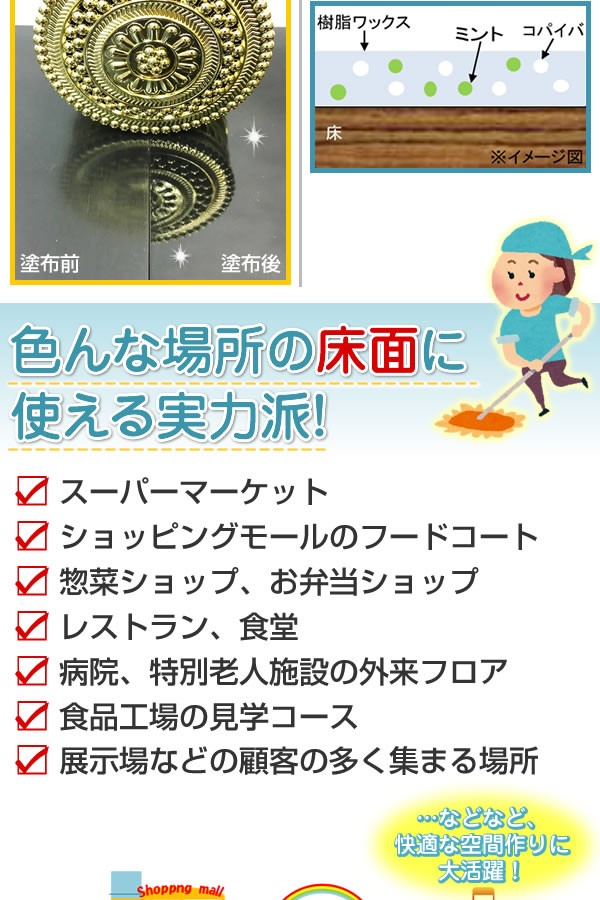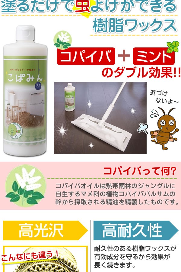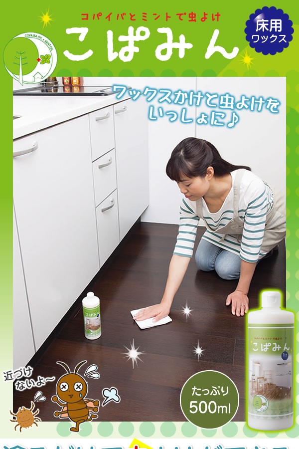 | 速乾性で品のある光沢、フローリングコーティングに最適な「こぱみん 床用ワックス」です。ワックスするだけで虫よけもできます。虫よけ成分は、コパイバとミントだから安心♪効果は約3か月と長期間持続。食品の多いキッチンの床、カーペットの下、寝室、虫が出入りする玄関やベランダに。高光沢/クリア/耐久/速乾/ミント/床用ワックス/フローリング/ワックス掛け/床掃除/フローリングワックス/フロアー用ワックス |