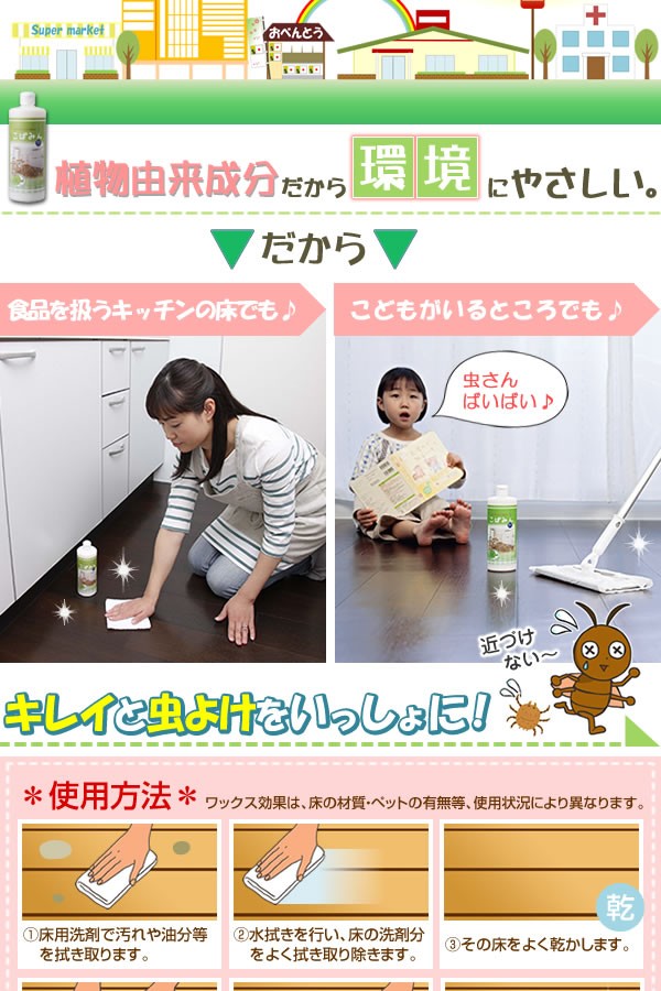 | 速乾性で品のある光沢、フローリングコーティングに最適な「こぱみん 床用ワックス」です。ワックスするだけで虫よけもできます。虫よけ成分は、コパイバとミントだから安心♪効果は約3か月と長期間持続。食品の多いキッチンの床、カーペットの下、寝室、虫が出入りする玄関やベランダに。 |