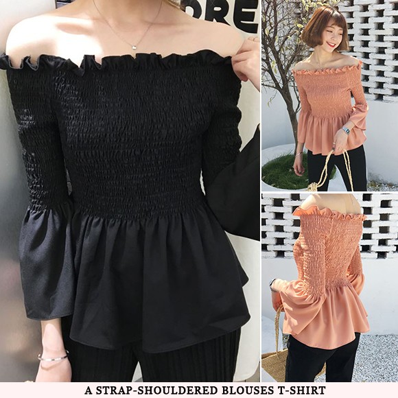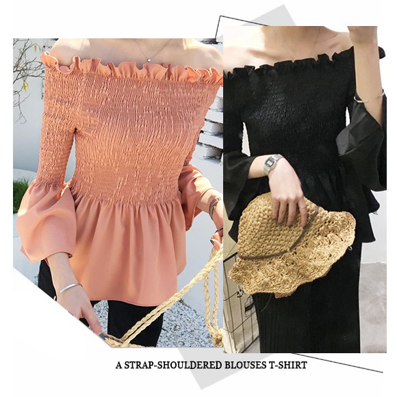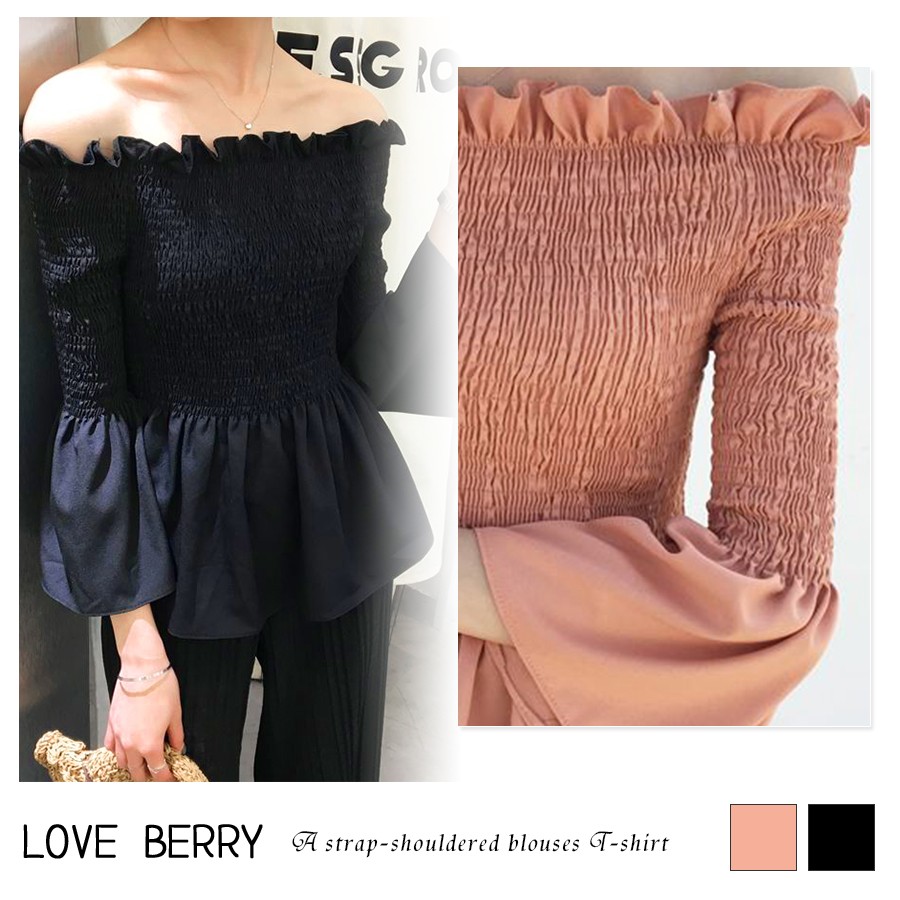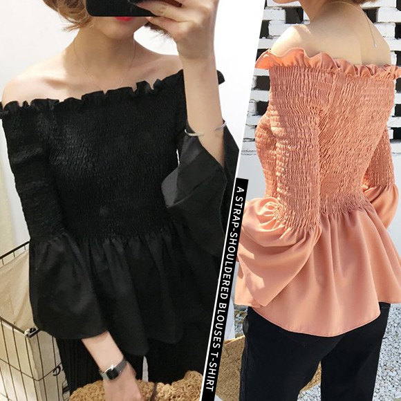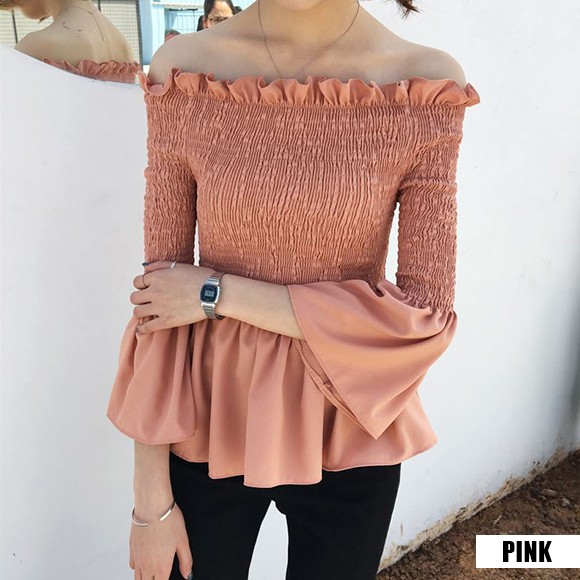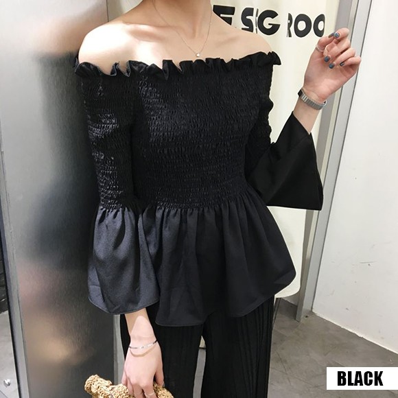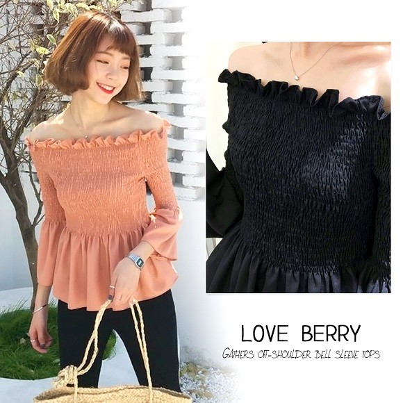 胸元と袖部分にギャザーが入っているオフショルトップスです。