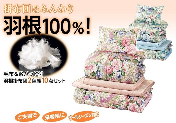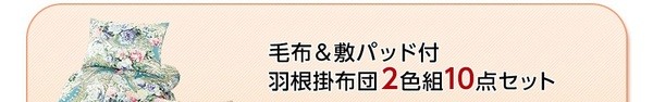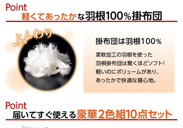 【商品名】羽根掛け布団2色組10点セット 【1: レギュラータイプ】 シングルサイズ 掛布団:羽根100% 毛布/敷パッド付き