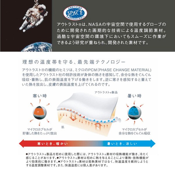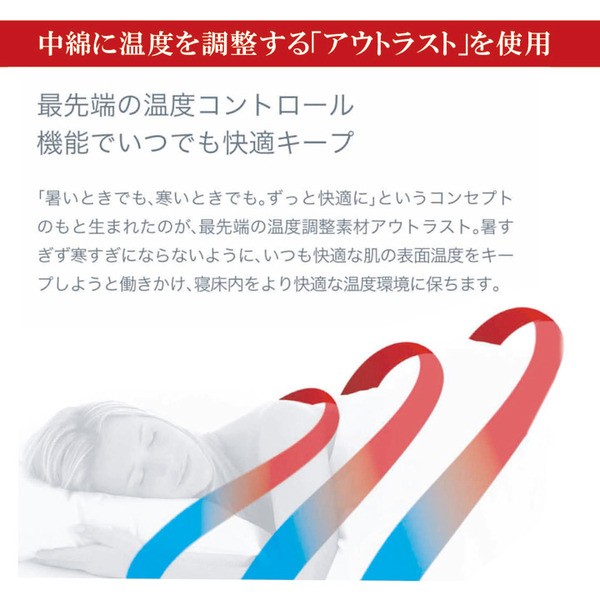 中綿に温度調整素材アウトラストを使用しています。「暑いときでも、寒いときでも、ずっと快適に」というコンセプトのもと生まれたのが、温度調節素材アウトラストです。アウトラストは、暑すぎ寒すぎにならないように、いつも快適な肌の表面温度をキープしようと働きかけ、寝床内をより快適な温度環境に保ちます。アウトラストの機能のヒミツは、ミクロのPcm(PHASE CHANGE MATERIAL)を使用したアウトラスト社の特許技術が身体の熱さを感知して、余分な熱をぐんぐん吸収・蓄熱し、肌の表面温度を下げる働きをします。逆に寒さを感知すると蓄えていた熱を放出し、皮膚の表面温度を上げてくれるのです。