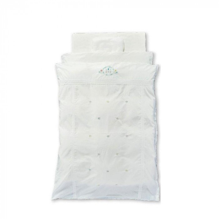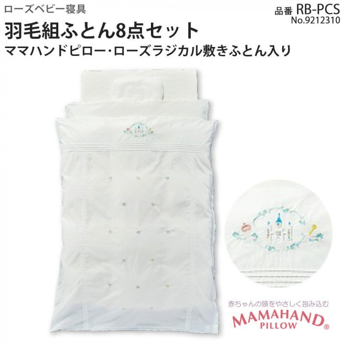 お城とお花の繊細な刺繍入りの組ふとん8点セット。軽くて保温性に優れた羽毛を使用した掛けふとんと、赤ちゃんの背骨をしっかり支えるローズラジカル敷きふとんで赤ちゃんの快適な眠りをサポートします。 |