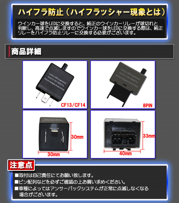 ●純正のウィンカーランプからLEDのバルブに変更した際に、ハイフラ現象(ウインカーの点滅が異常に早くなる現象)を防ぐために使用します。