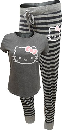 This is classic Hello Kitty at her best! These pajama sets for women feature the much loved Sanrio cat, Hello Kitty. The gray tee is paired with a striped bottom. Pants have a wide elastic with a drawstring. Machine washable and easy care. Junior cut.Feature