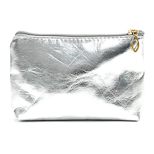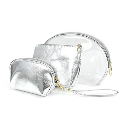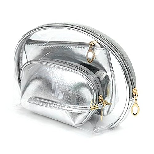 Set of 3 Metallic Silver & Clear Make Up Cosmetic Travel Case Bags