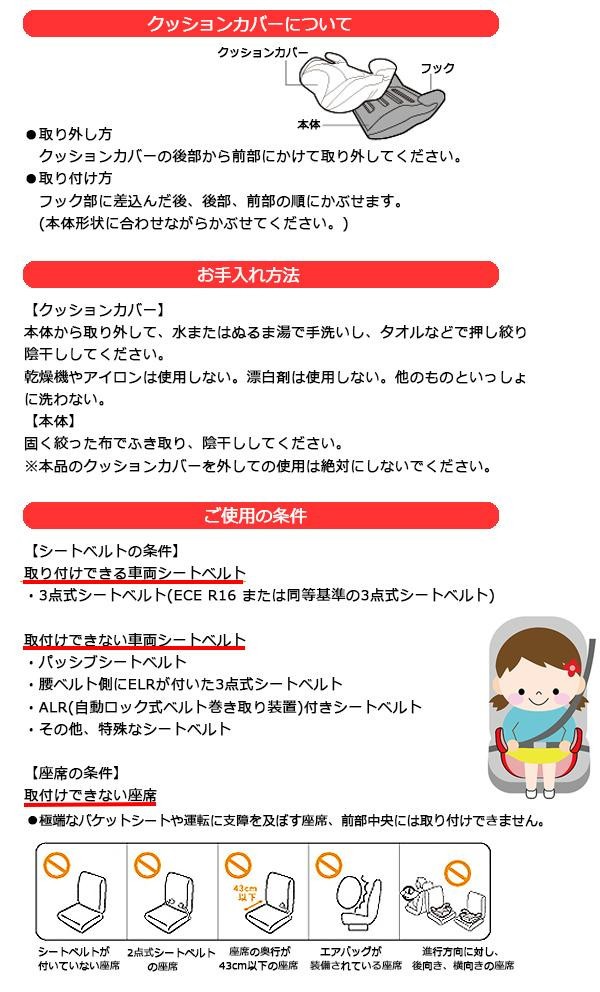 | 仕様 | ECE(欧州安全基準)R44/04安全基準適合品(汎用型グループII~III) 【適応条件】 ・体重:15kg以上~36kg未満 ・身長(目安):100~138cm ・年齢(目安):3歳~10歳頃 ・腰が安定し、1人座りができること。 |