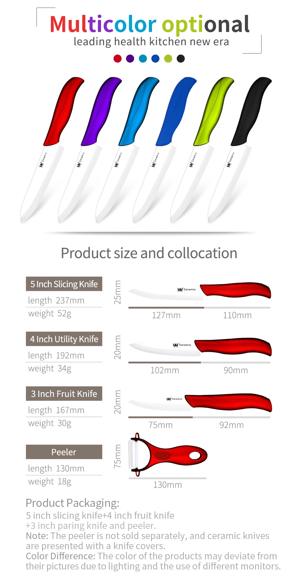 Packaging Includes:3" Paring 4" Utility 5"Slicing Knife&Peeler