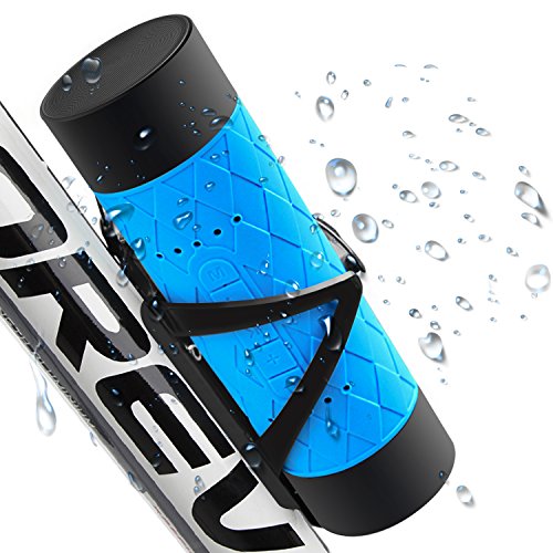 -. Feature : CRYSTAL CLEAR SOUND AND POWERFUL HIGH VOLUME:>75db SNR and <1% distortion achieve abundant clear sound without distortion even at highest volume. And dual 5 W powerful drivers deliver bright enough sound, balanced bass.It gives you very enjoyable experience whether you are listening music or playing games. / WATER RESIESSTANT IP65 BUCKLE DESIGN FOR OUDOOER SPORTSD : Water resistant IPX5 rating make it splash-proof, rain-proof, dust-proof, drop-proof.without worry that it cant work in case of falling to ground. Unique design with buckle ,easy hook it onto your bag for travel or onto bicycle for climbing. / 12 HOURS PLAYTIME AND 360 HOURS STANDBYTIME: Built-in 4400mAh Rechargeable Battery, one 2 hours charge lasts 12 hours of endless music at 2/3 volume and 360 hours standby time.With USB port,It can be used as a power bank to recharge your phone,i pad,MP3 player in urgent need. / UNIVERSAL COMPATIBILITY WITH FAST AND STABLE CONNECTION: Compatible with Bluetooth devices including iPhone, iPad, iPod,Android Smart phones, Tablets thanks to latest Bluetooth 4.0 technology with range up to 33 feet (10M).As well as non-Bluetooth devices through 3.5mm aux input to listen to your favorite music. / MICRO SD Card AND HAND-FREE CALL:Music play automatically after inserting a SD Card.The maximum capacity of SD card the speaker support is 32GB. Enjoy hands-free callings and use this wireless speaker with built-in microphone as a speakerphone. Perfect for both home and outdoor use!