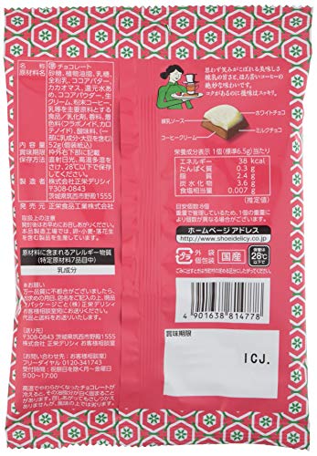 原材料:砂糖、植物油脂、乳糖、全粉乳、ココアバター、カカオマス、還元水あめ、ココアパウダー、生クリーム、粉末コーヒー、乳等を主要原料とする食品/乳化剤、香料、着色料(フラボノイド、カロテノイド)、酸味料、(一部に乳成分・大豆を含む)