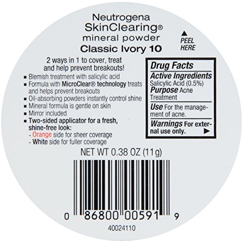 -. Binding : Health and Beauty -. Brand : Neutrogena -. EAN : 0086800005919 -. Feature : Mineral face powder makeup in a compact / Coverage for a fresh, shine-free look / Conceals and helps treat acne / Compact with MICROCLEAR technology treats and helps prevent breakouts / Salicylic acid acne treatment with minerals -. Label : Johnson & Johnson SLC (Cosmetics) -. Manufacturer : Johnson & Johnson SLC (Cosmetics) -. PackageQuantity : 1 -. ProductGroup : Pantry -. ProductTypeName : BEAUTY -. Publisher : Johnson & Johnson SLC (Cosmetics) -. Studio : Johnson & Johnson SLC (Cosmetics) -. Title : Neutrogena Skin Clearing Mineral Powder, Classic Ivory 10, 0.38 Ounce -. UPC : 086800005919