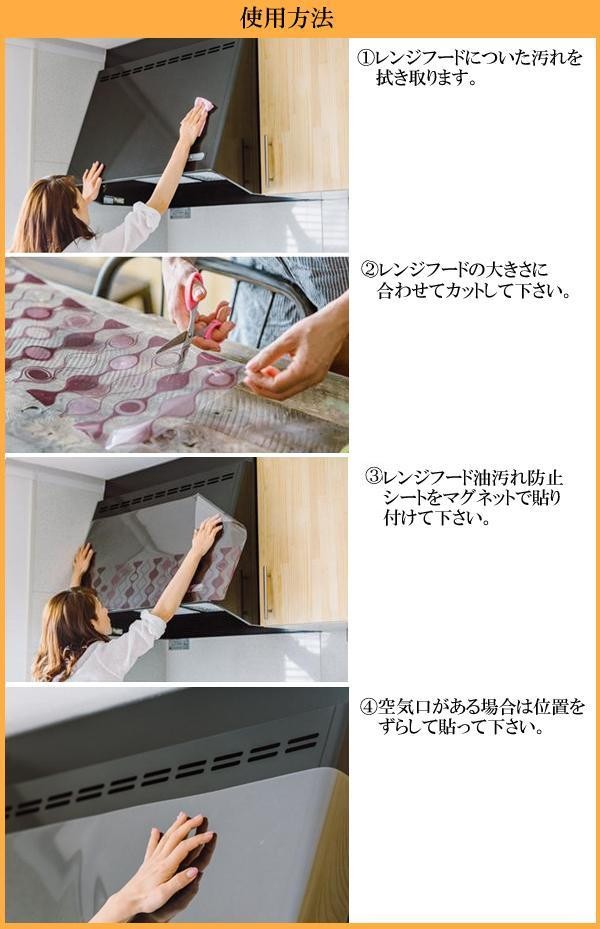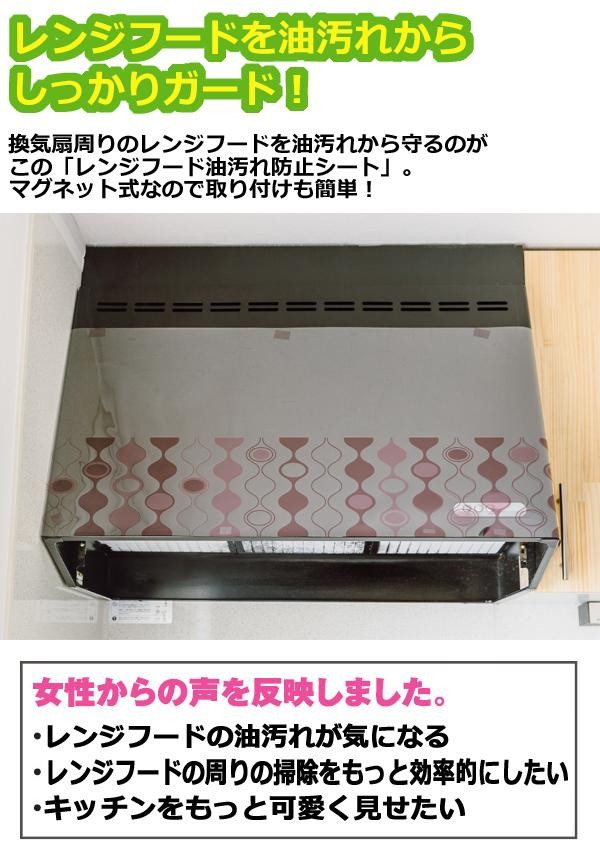 | 付属のマグネットでレンジフードに貼り付けるだけで油汚れからレンジフードをガード。汚れた時の取り替えも簡単です。ハサミで好きな長さにカットできるので、様々なサイズのレンジフードに対応します。 |