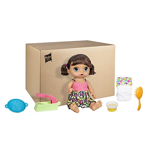 Making zany noodles is oodles of fun! The Baby Alive Snackin' Noodles Baby doll is a sweet little girl who asks for her noodles! She comes with an extruder and a bowl so kids can load the extruder with reusable doll food to turn it into noodle shapes! Fill her bowl and feed her the noodle shapes! Then, it's time for a diaper change -- kids can open the diaper to see that she's "pooped" and clean her up for more play time fun. Tickle her belly and she'll start talking! Flip the switch in her back to choose who she's speaking to -- she says "Mommy" and "Daddy" so girls and boys can play out fun, meal-time moments. The Snackin' Noodles Baby doll tells kids when she's hungry, asks for pretend noodles, thanks Mommy or Daddy, and more, saying 20 plus sounds and phrases in English or Spanish. Brush and style her rooted hair and get her ready for more noodly fun! Baby Alive and all related properties are trademarks of Hasbro.Feature