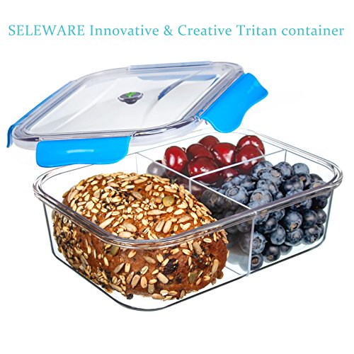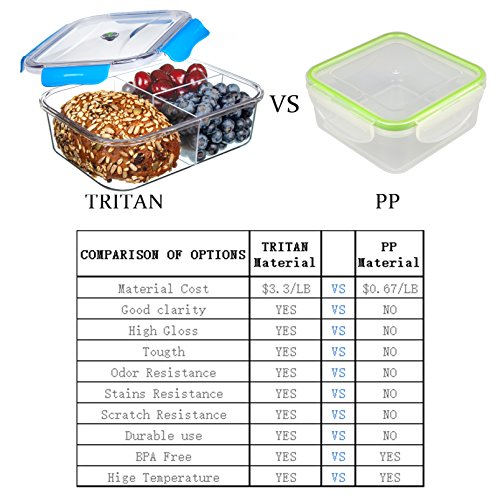 - DIVIDED 3 COMPARTMENT TRITAN PLASTIC DESIGN: The storage Containers offer a unique rectangle Tritan plastic divider with standard height divider, preventing food from mixing during travel or changing taste when heating. The snap locking BPA-free lids with built in silicone gasket to keep food fresh,100% leak proof and air tight.