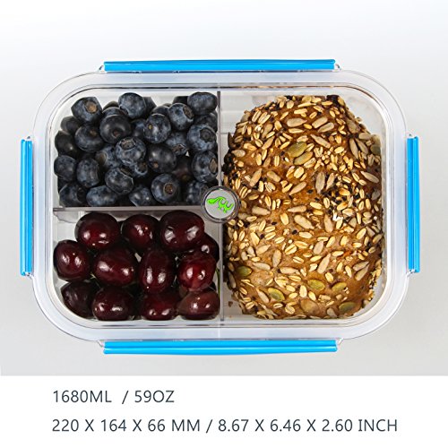 Food Storage Container, Plastic Tritan Meal Prep Container 3 Compartment Airtight Food Container, Bento Lunch Box, Lunch Container, BPA-Free, Microwave, Freezer, Dishwasher Safe [59oz, Blue]