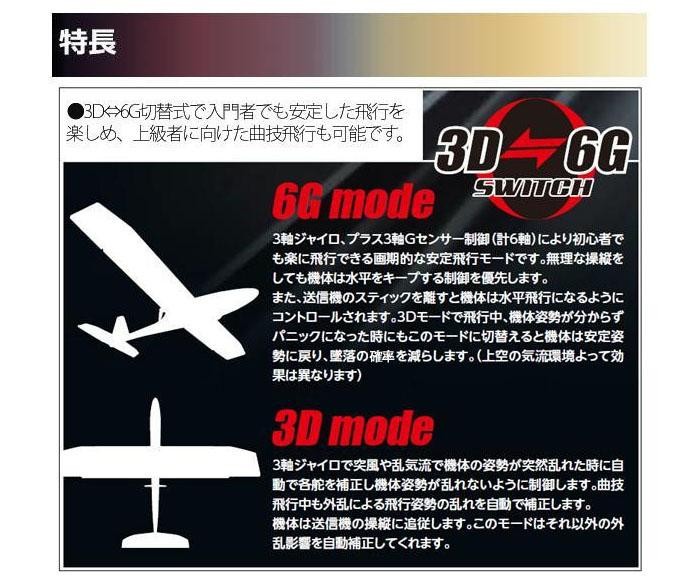 | 仕様 | ●機体本体バッテリー:3.7V 500mAh 25C Li-po ●モーター:ブラシレスモーター×1、コアレスモーター×1 ●3D6Gシステム搭載 ●フライト時間:約5分(※) ●充電時間:約1時間(※) ※バッテリーの状態により異なる ●USBケーブル長:60cm ●対象年齢:15歳以上 ●送信機用電池:単三電池×6本(別売) |