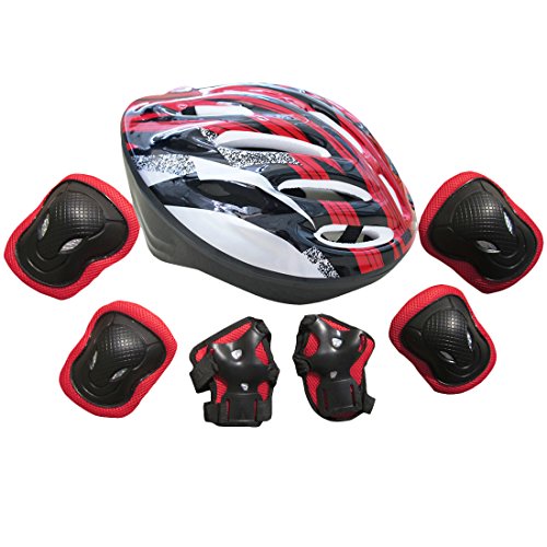-. Feature : Made of durable, breathable EVA padded material and with sturdy plastic plates,safe for you to use. / Head circumference: About 22.6-24inch/58-62cm. With velcro straps for secure fit for various knee girths. / Package:wrist guards, knee pads and elbow pads also helmet included. / Totally 7pcs set protective gear, bring you all-round and perfect protection avoid injury. / Suitable for skateboarding,scooter,inline roller,indoor skating,bicycle and other outdoor sports.