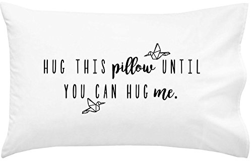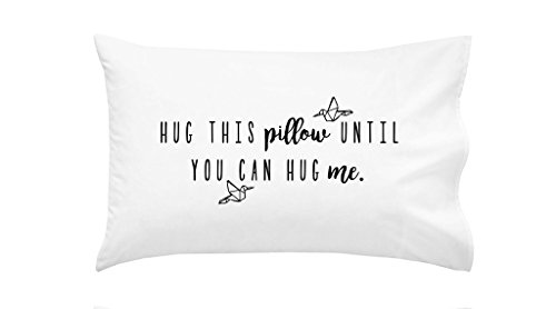 HUG THIS PILLOW UNTIL YOU CAN HUG ME!If you're in a long distance relationship you understand the pain to not be with your loved one every night, but at least this pillow case can send the right message while you're apart! One (1) 20x30" Standard/Queen Size Pillow Case. PERFECT GIFT- You will bring smiles and maybe more! Great Present for: him or her, anniversary, wedding, engagement, Christmas, Valentines Day, boyfriend, girlfriend, long distance relationship, cotton anniversary, romantic gift, wife, husband, I'm sorry gift, because: love, just because, bride and groom. - no screenprinted material