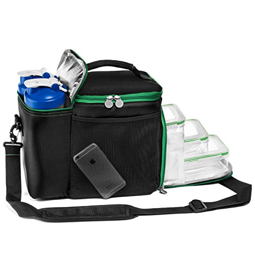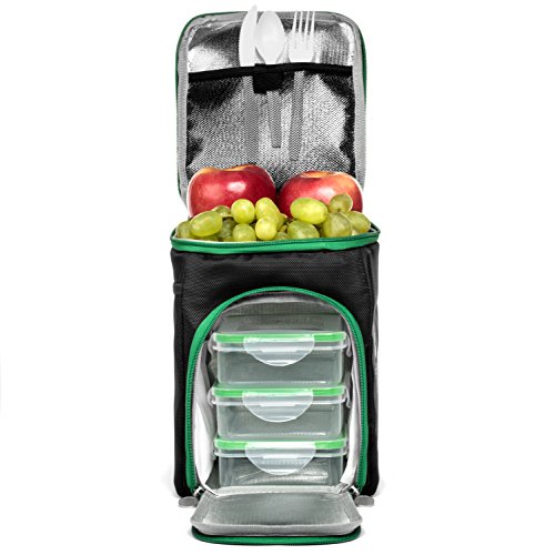 Emerald Living Meal Prep Bag with Containers (3-Pack) & 2 Cooler Gel Packs | Work, School, Travel Lunch Tote | Shoulder Strap, Multiple Storage Pockets | Reusable, Stackable Portion Control Boxes