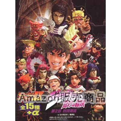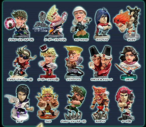 17種セット:内訳: 01 ジョセフ・ジョースターA、 02 シーザー・ツェペリA、 03 スピードワゴン、 04.ストレイツォ、 05.サンタナ、 06.ジョセフ・ジョースターB、 07.シーザー・ツェペリB、 08.シュトロハイム、 09.ロギンズ&メッシーナ、 10.リサリサ、 11.カーズA、 12.ワムウ、 13.ジョセフ・ジョースターC、 14.エシディシ、 15.カーズB、 シークレット.エイジャの赤石、 限定特典 石仮面