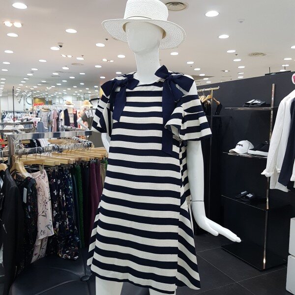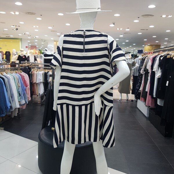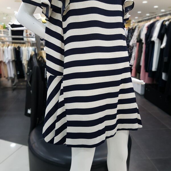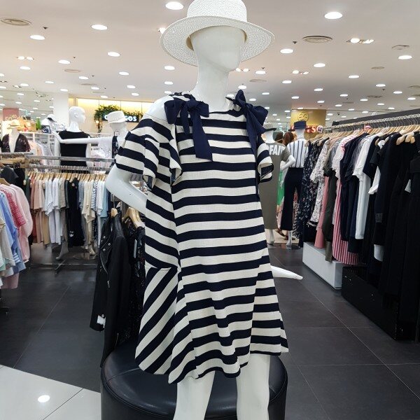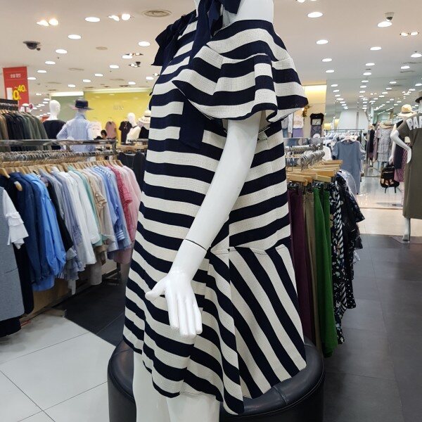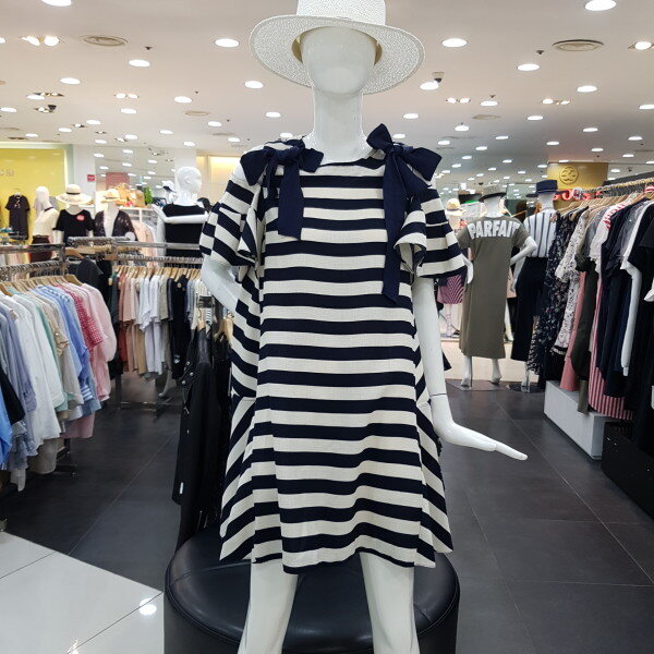 스트라이프 패턴의 오프숄더 원피스 입니다어깨리본 장식처리로 러블리한 느낌을 더해주며, 넉넉한 A라인의 핏감과무릎선 기장감으로 편하고 시원하게 착용 가능한 제품 입니다 (리본안쪽 단추 고정으로 탈부착가능합니다)