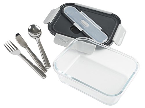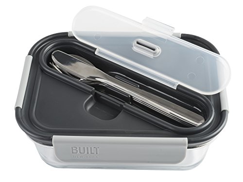 BUILT NY Gourmet Bento Glass Single Compartment Lunch Container with Stainless Steel Utensils Set, 30-Ounce, Black