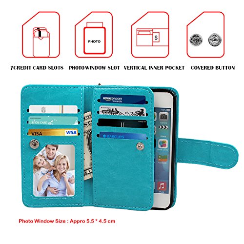 Wallet feature: the exterior detachable flip case with 7 card slots(one with clear window, suitable for holding a small photo) & 3 cash compartments (one hidden compartment on the back) to conveniently store ID card, credit cards, business cards, cash & some paper notes. With a wristlet lanyard to wear on the wrist.
